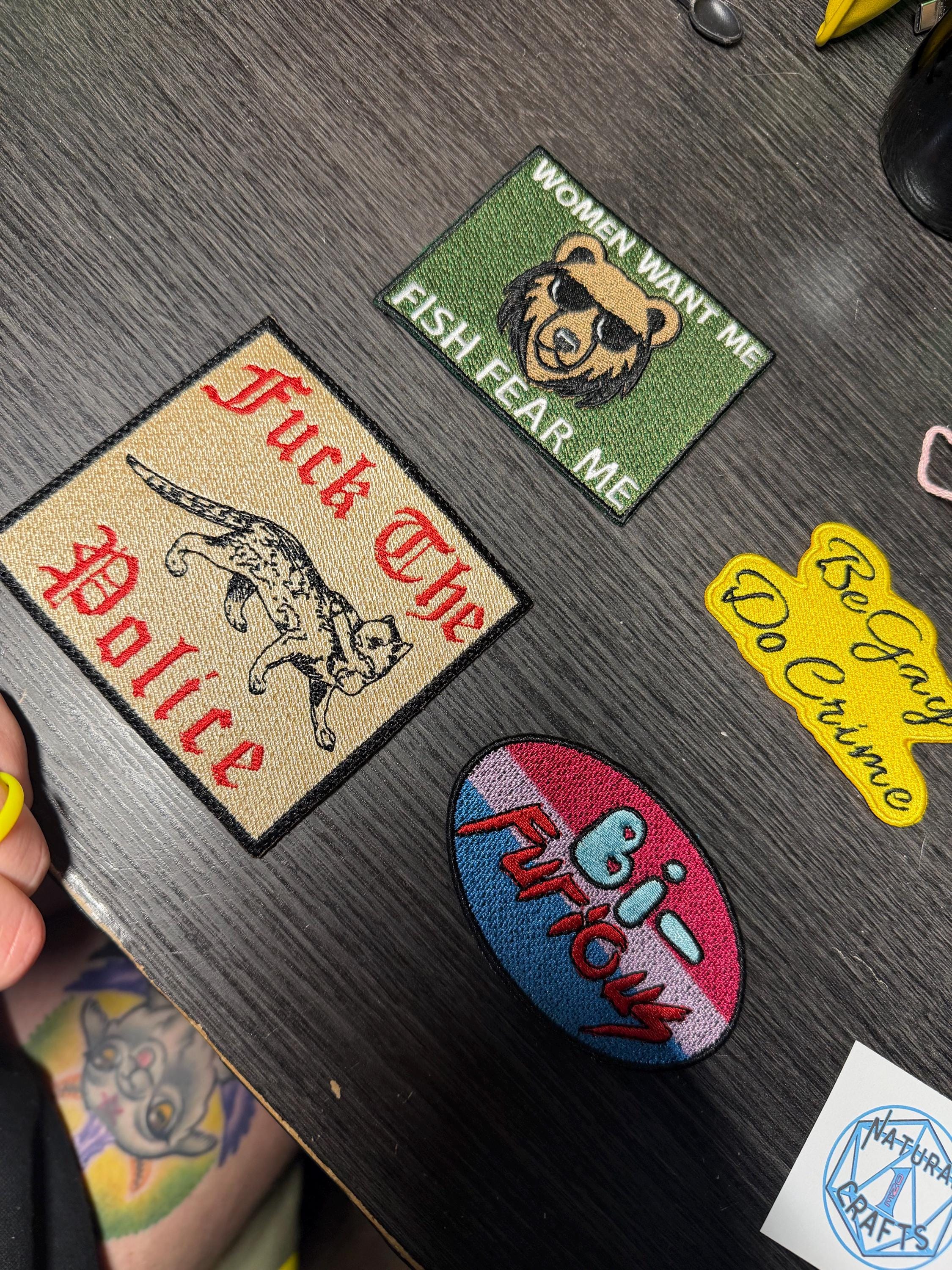 We have two patches available, one featuring just the naughty kitty by itself and the other with the "F*ck the Police" label in Medieval Script.