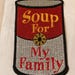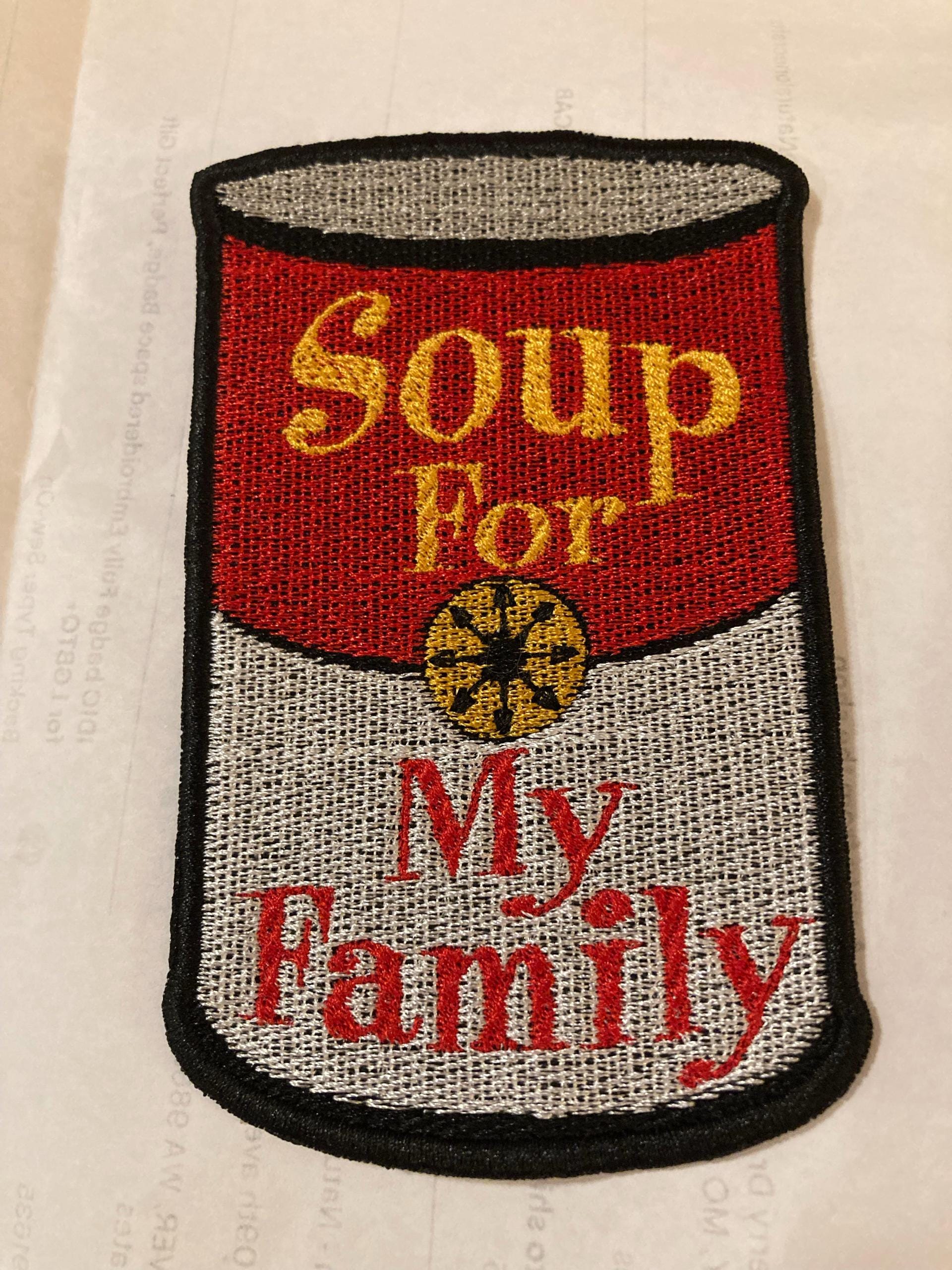 Embroidered Soup For My Family Patch. Perfect for battle vests/jackets. It's also roughly the size of a soup can, but don't recommend throwing it. We have two versions: One with Gold and Red font for aesthetic and the other with all black for better visibility.